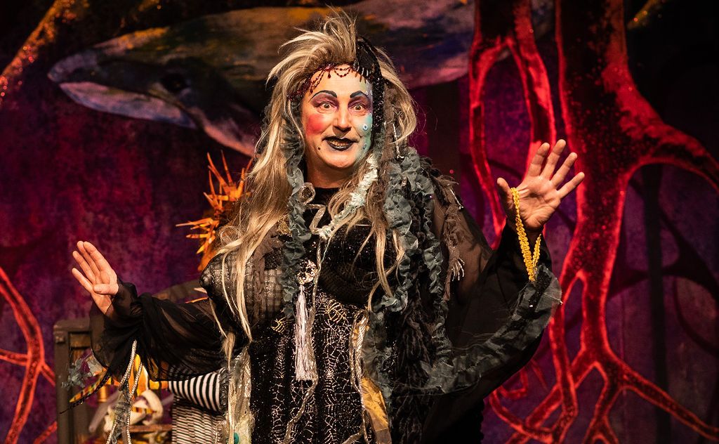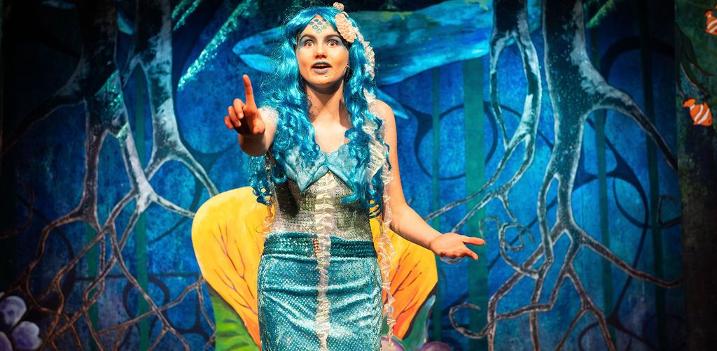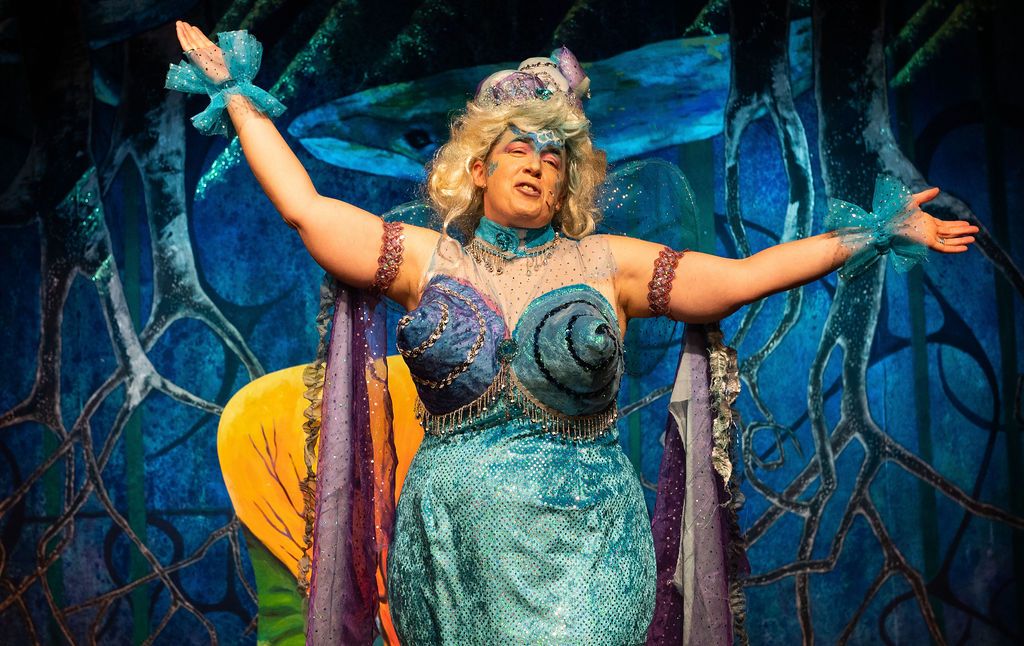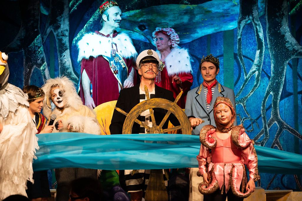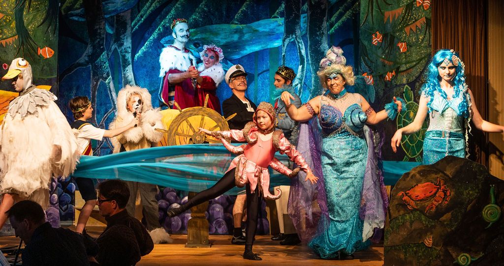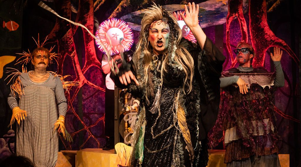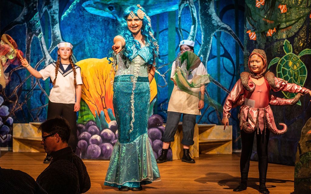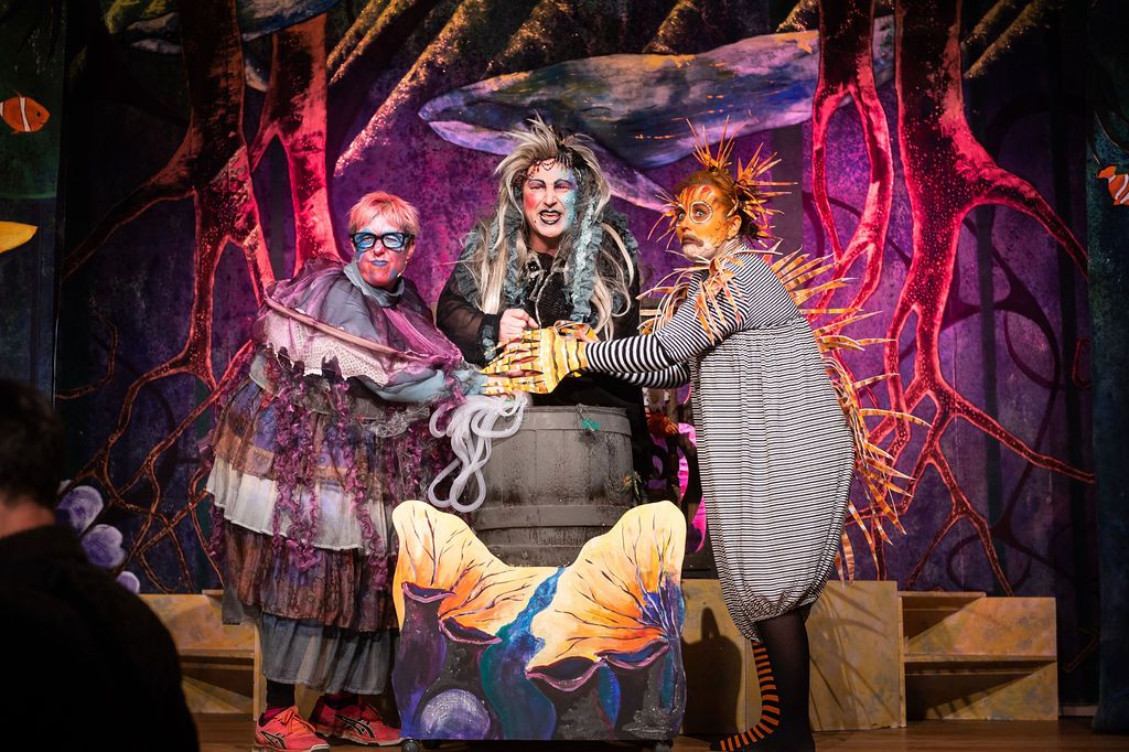 Whilst I was prancing about as a horse in The Three Musketeers pantomime of 2019, I was asked if I’d consider directing the following year. I had a think and replied yes, but only if I could direct The Little Mermaid. As a concept for a show, The Little Mermaid has it all. Beautiful, clear storytelling, and a brave, desperate heroine who has a truly horrible nemesis. Many opportunities for funny, larger than life characters. All set in two contrasting and opposing worlds; that of the land and that of the sea. The imagination of the whole team fired and suggestions flowed, producing the incredible backdrops, UV lights, sea-creature costumes, props including jellyfish poo, sea shanties, sailor dances, rocks and ramps. Our wonderfully talented cast arrived at rehearsals with lines learned, dances rehearsed, and