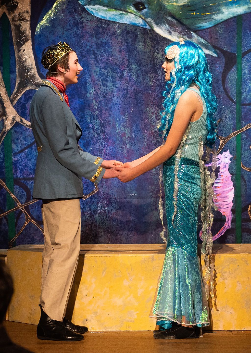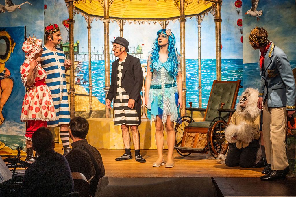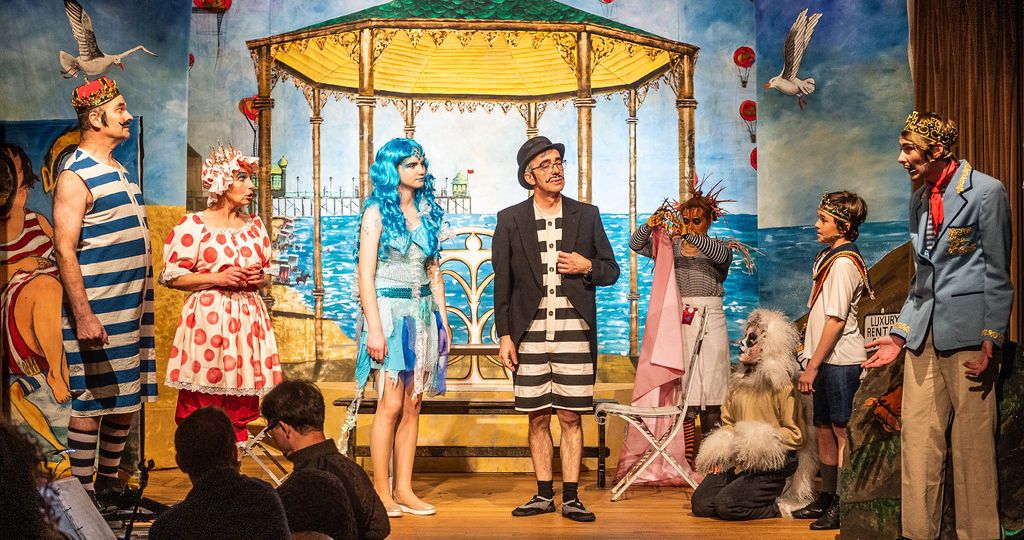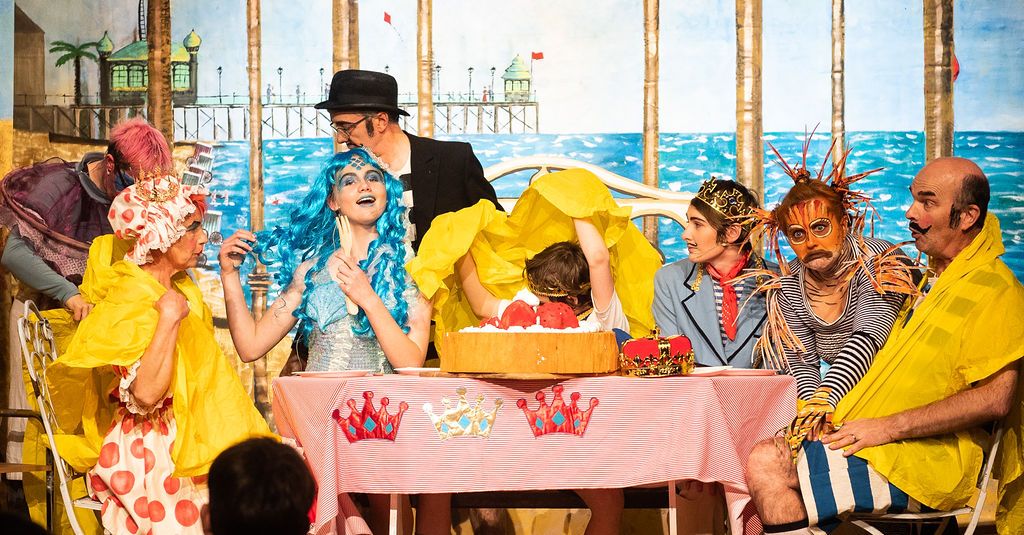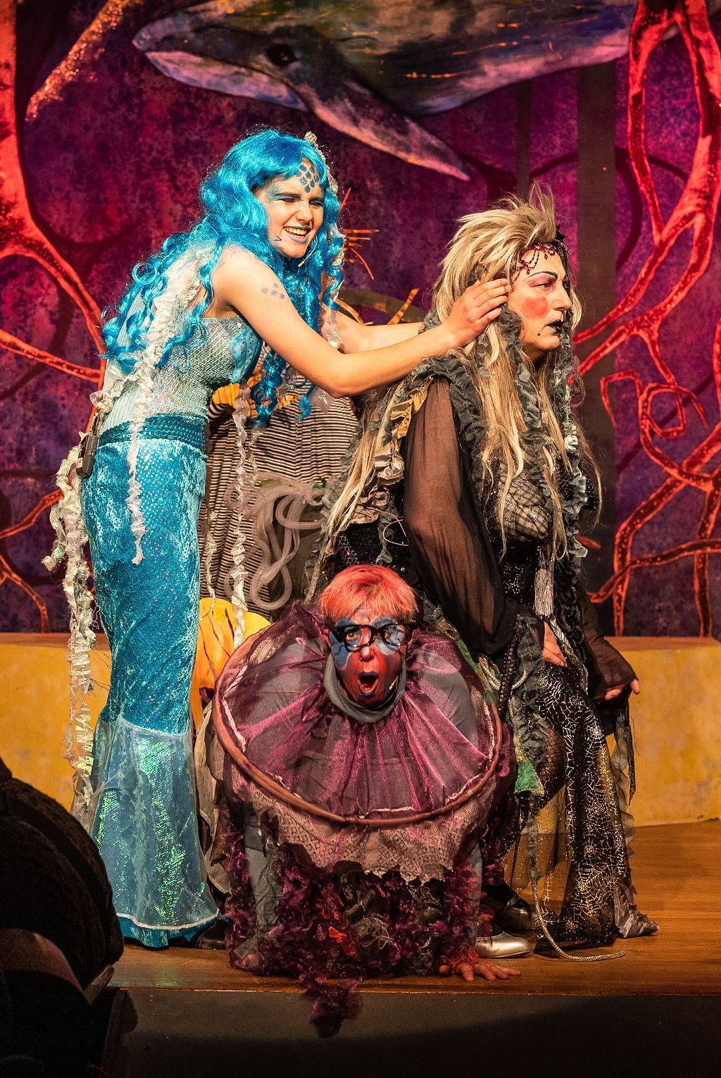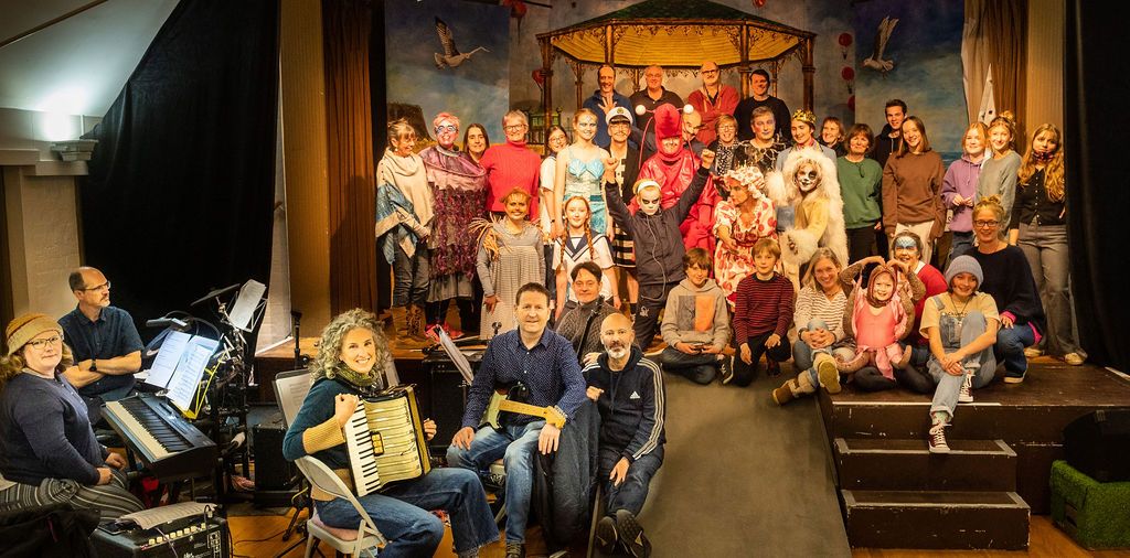Whilst I was prancing about as a horse in The Three Musketeers pantomime of 2019, I was asked if I’d consider directing the following year. I had a think and replied yes, but only if I could direct The Little Mermaid. As a concept for a show, The Little Mermaid has it all. Beautiful, clear storytelling, and a brave, desperate heroine who has a truly horrible nemesis. Many opportunities for funny, larger than life characters. All set in two contrasting and opposing worlds; that of the land and that of the sea. The imagination of the whole team fired and suggestions flowed, producing the incredible backdrops, UV lights, sea-creature costumes, props including jellyfish poo, sea shanties, sailor dances, rocks and ramps. Our wonderfully talented cast arrived at rehearsals with lines learned, dances rehearsed, and