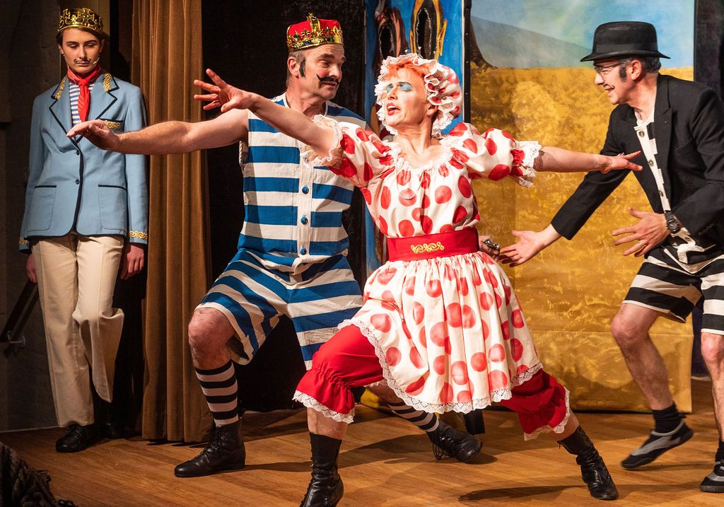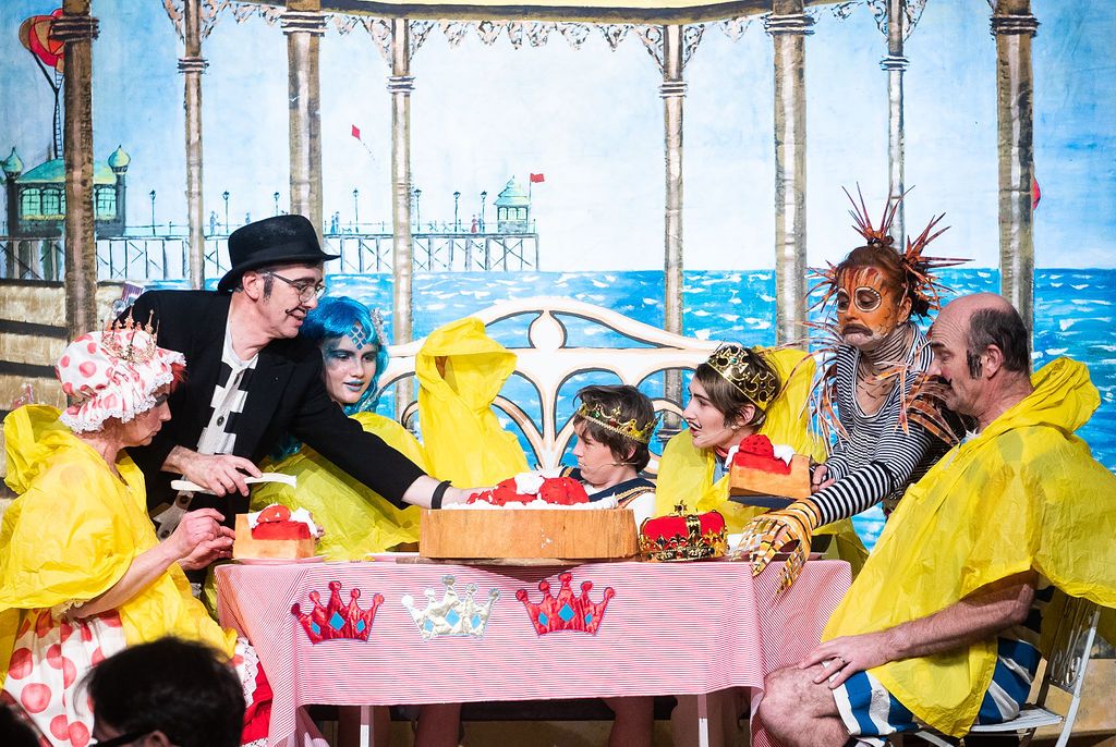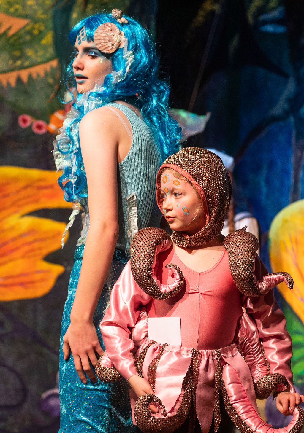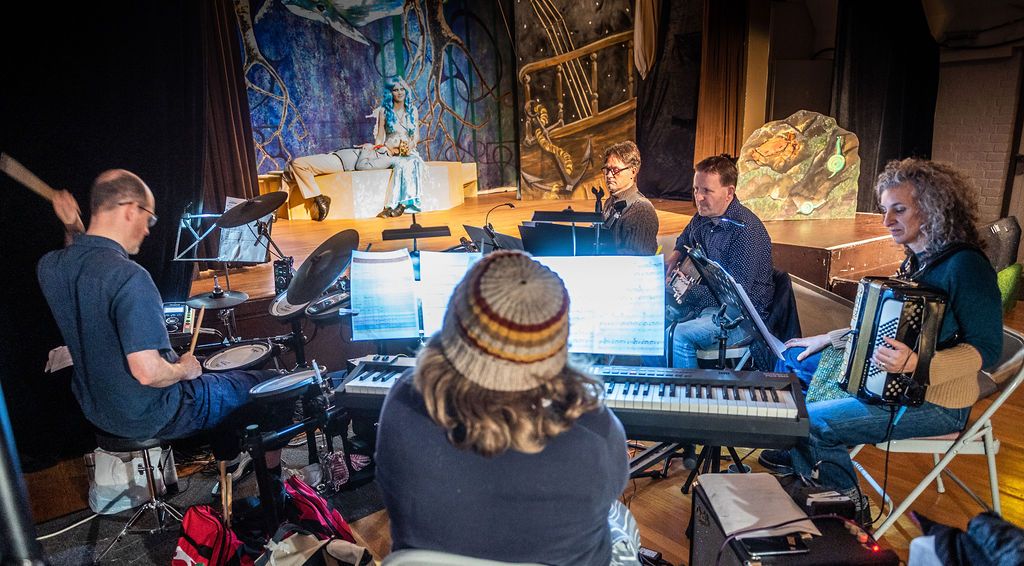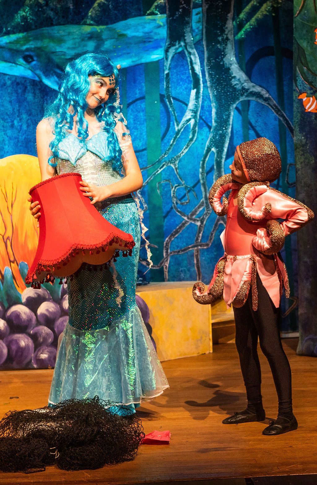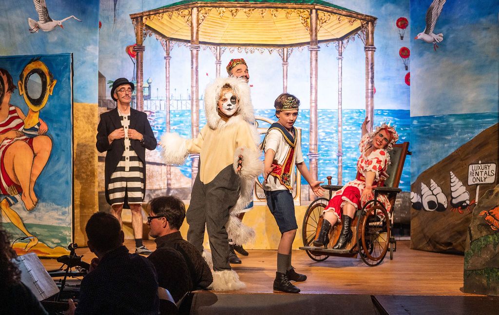 Whilst I was prancing about as a horse in The Three Musketeers pantomime of 2019, I was asked if I’d consider directing the following year. I had a think and replied yes, but only if I could direct The Little Mermaid. As a concept for a show, The Little Mermaid has it all. Beautiful, clear storytelling, and a brave, desperate heroine who has a truly horrible nemesis. Many opportunities for funny, larger than life characters. All set in two contrasting and opposing worlds; that of the land and that of the sea. The imagination of the whole team fired and suggestions flowed, producing the incredible backdrops, UV lights, sea-creature costumes, props including jellyfish poo, sea shanties, sailor dances, rocks and ramps. Our wonderfully talented cast arrived at rehearsals with lines learned, dances rehearsed, and