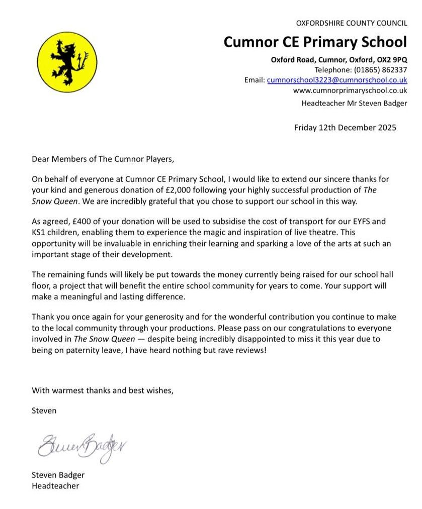 Once again, my congratulations and sincere thanks on behalf of everyone at Cumnor CE Primary School.